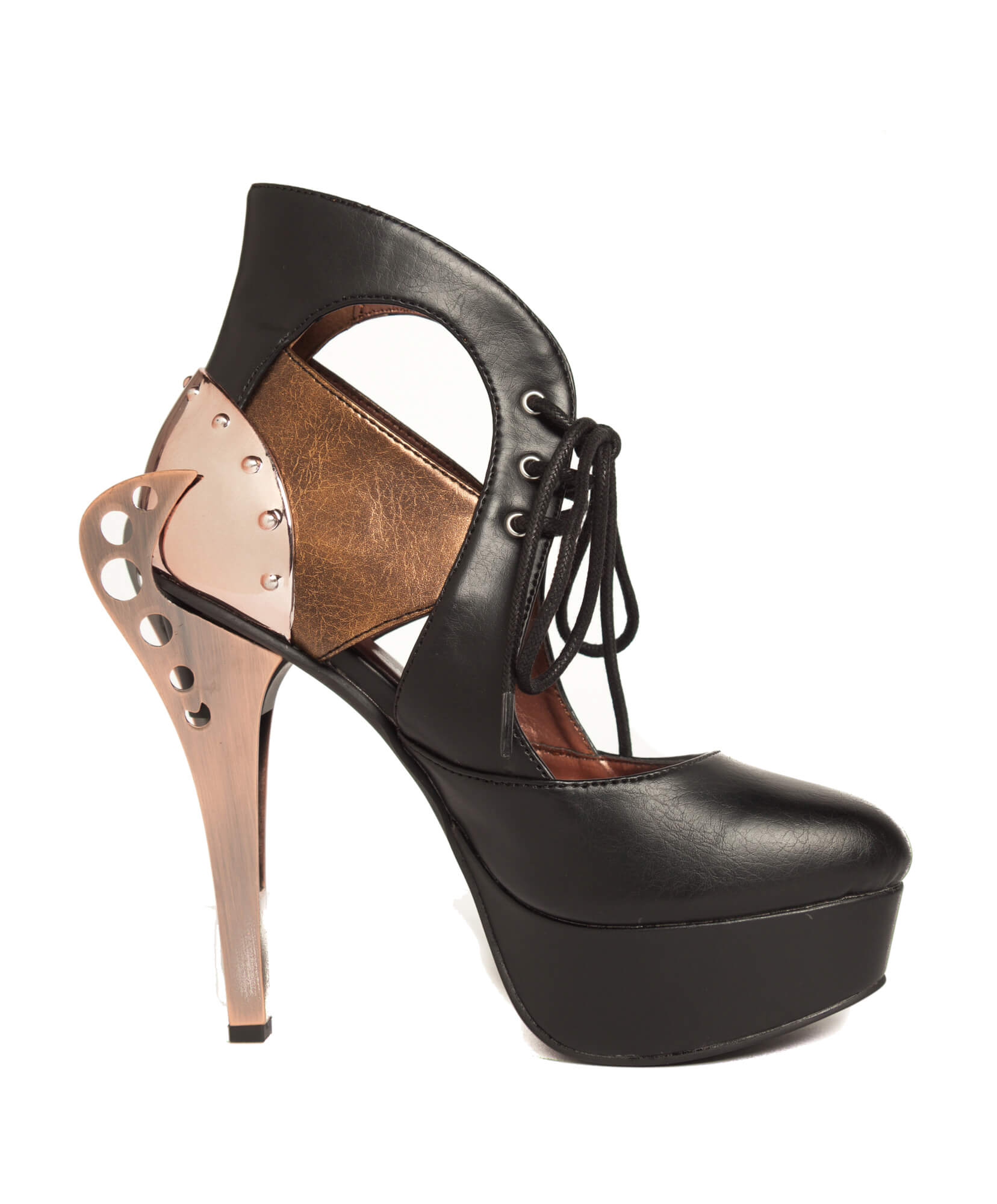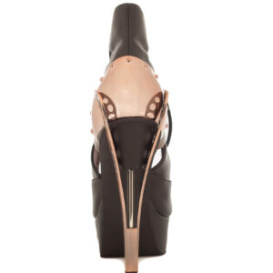 Steampunk inspired double sided custom cut metal heel, 1.5″ platform, two toned sandals w/ elastic on side for comfort.