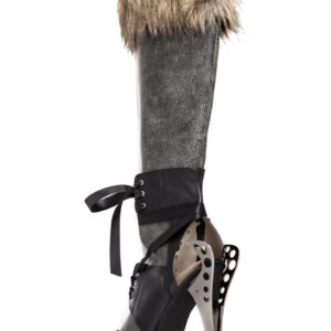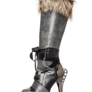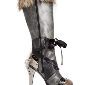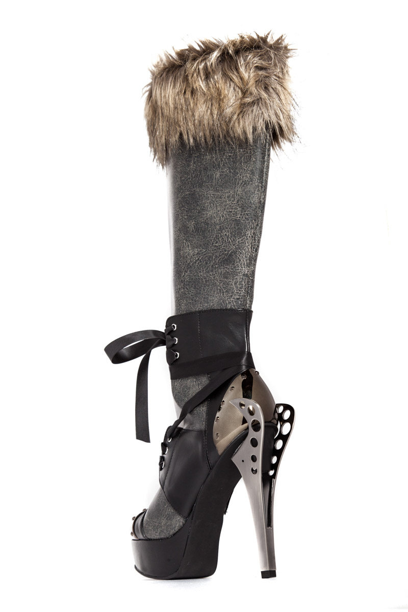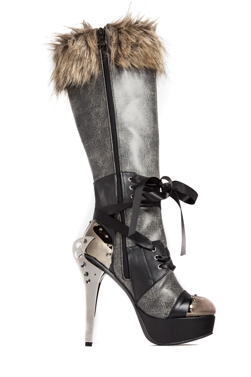 Hades exclusive knee high boots with steel toe & vegan three toned fur. Double plated Steampunk metal heel with custom cut open circles. Inner zipper and front satin lace for easy fit.