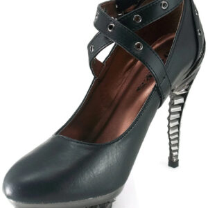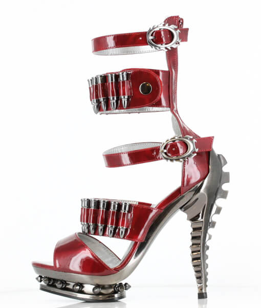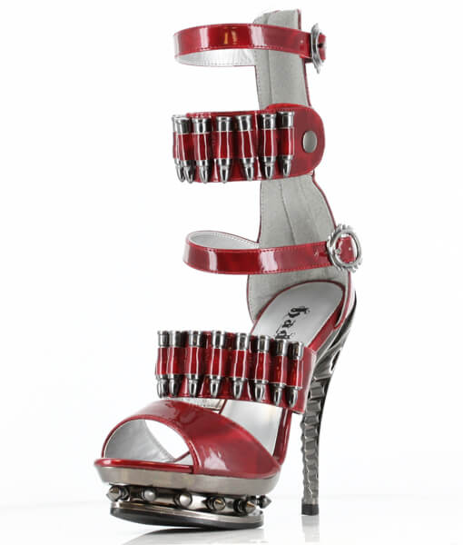 Skeleton molded ABS heel w/ spike rivets in platform. Adjustable mid & upper straps w/ silver flame buckles. Back zipper. Mock bullets