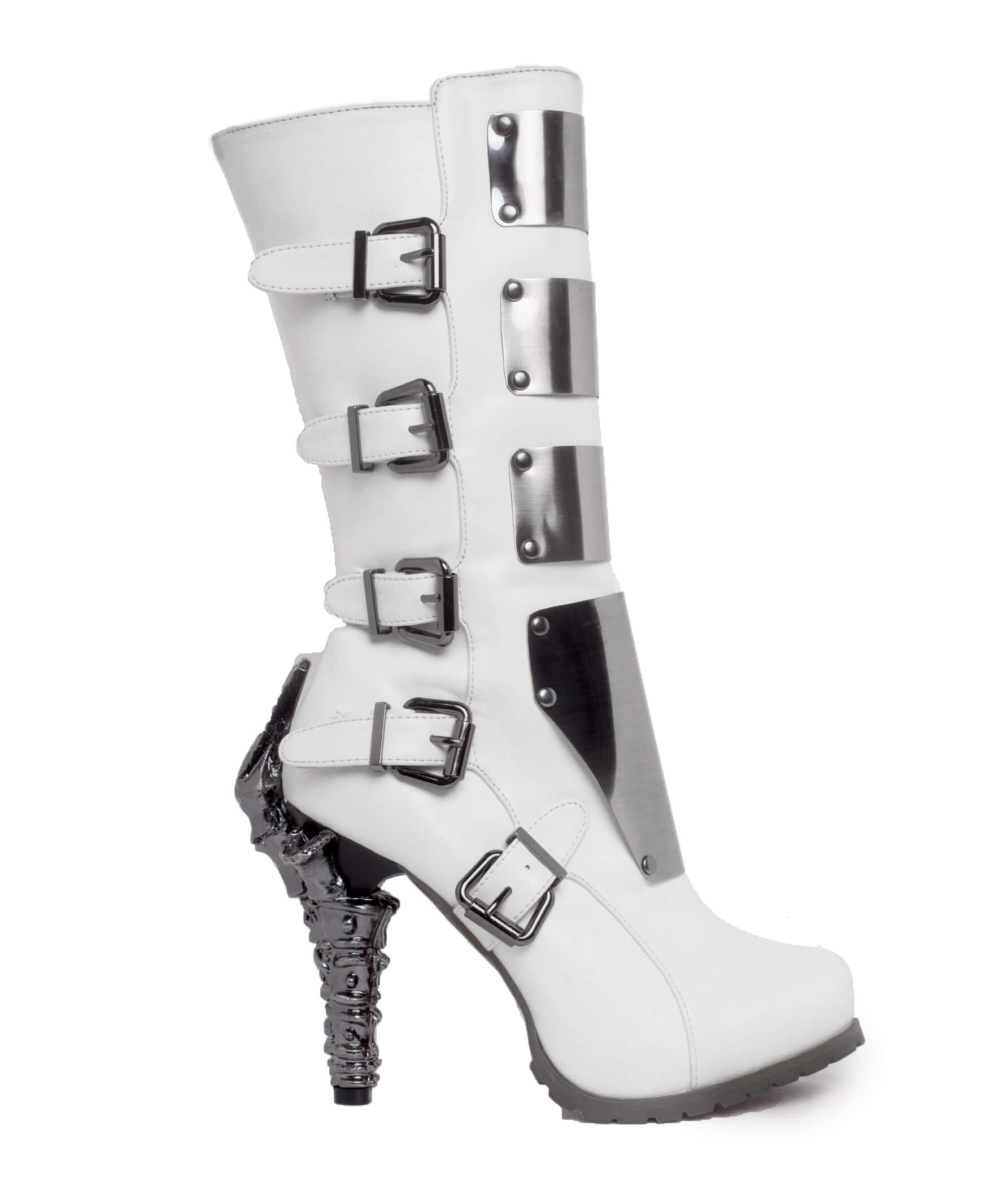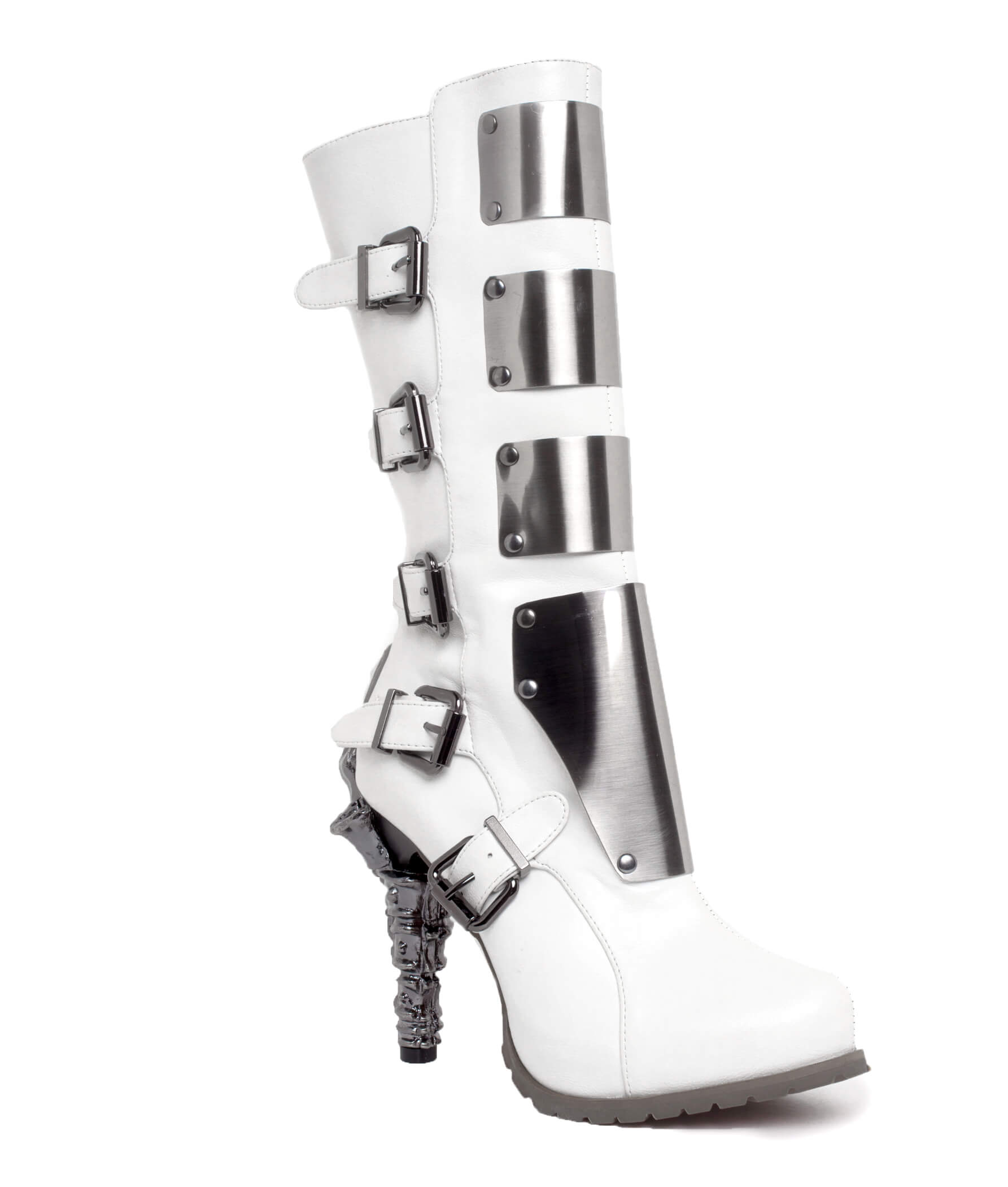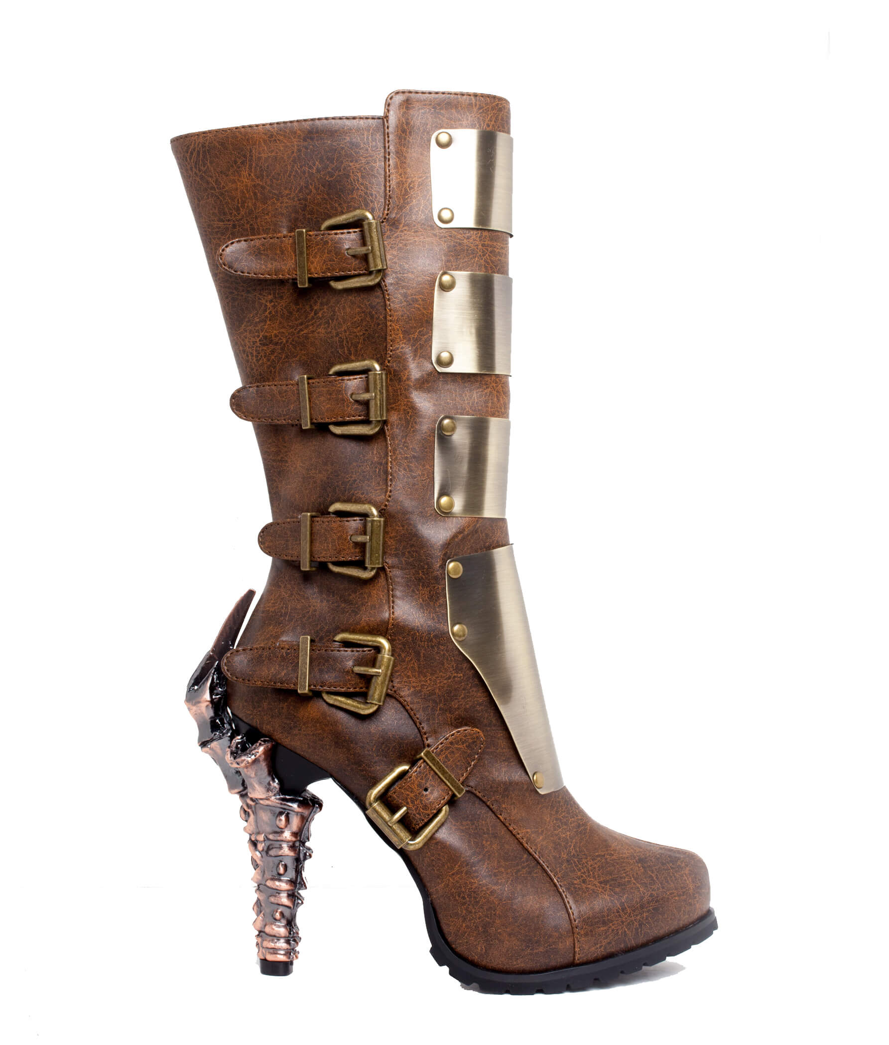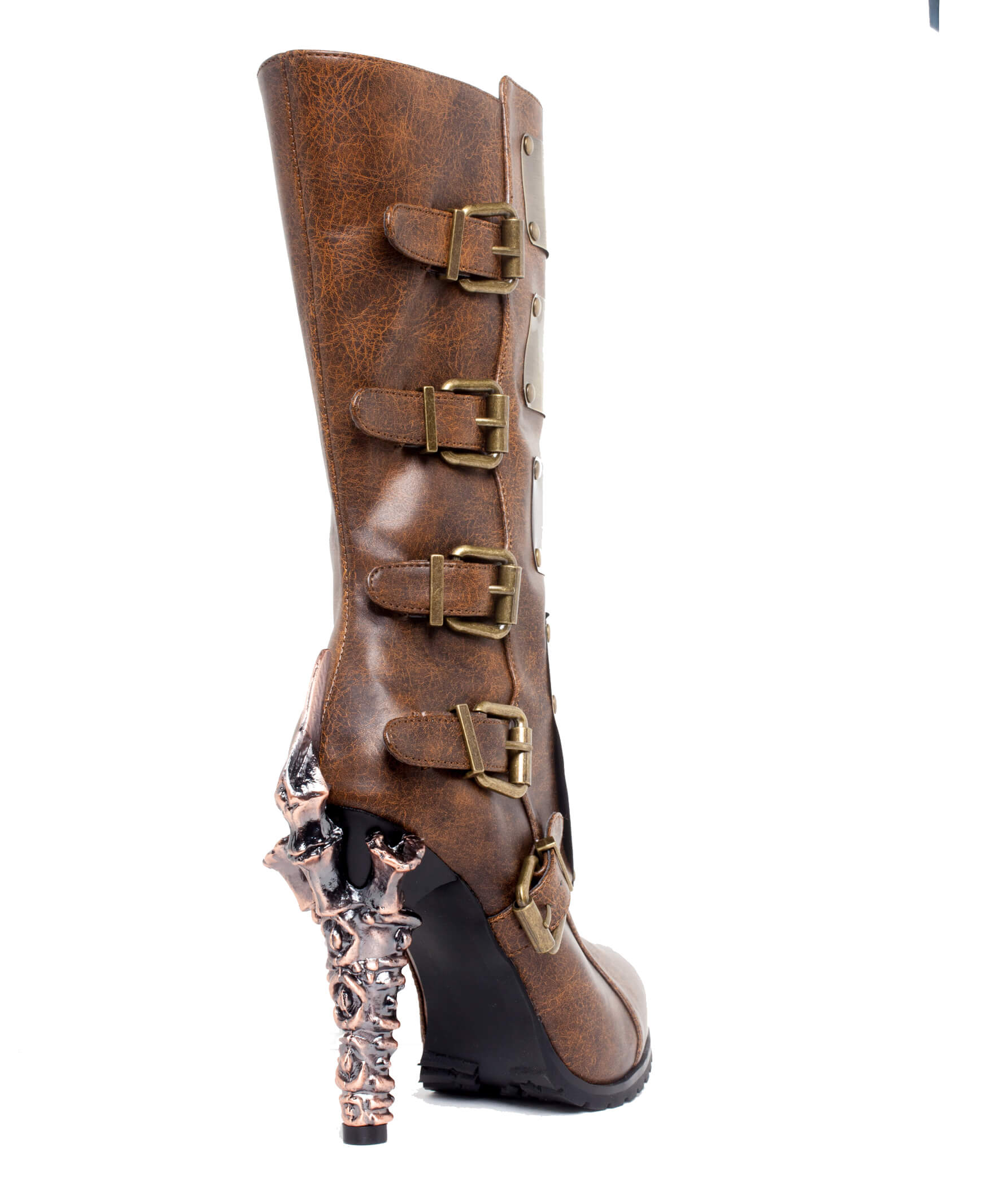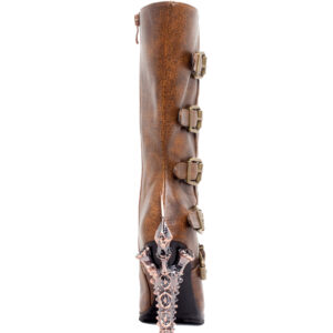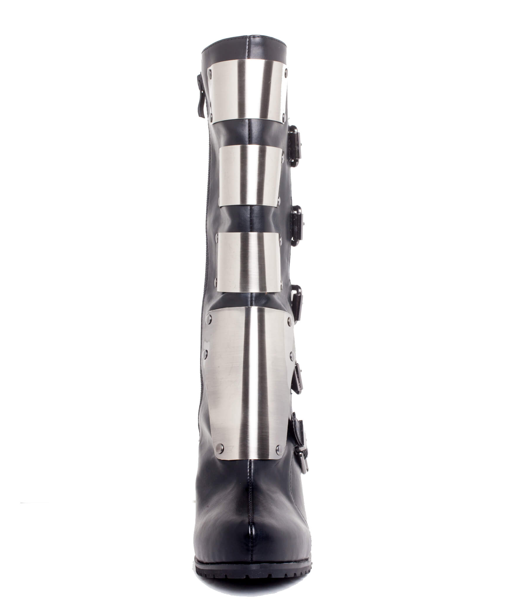 Knee high biker boots with custom cut metal plates, inner zipper included with adjustable side buckles, double cushion insole with think rubber outsole for added comfort, designed on our new prehistoric 5″ claw heel!
