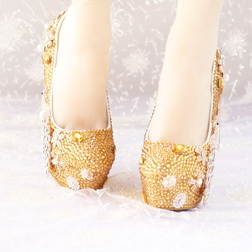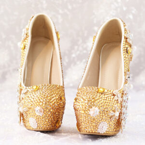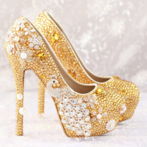 100% handmade Great for evening parties and weddings Covered in beautiful rhinestone and crystals, each individually adorned by professional shoemaker Wide range of sizes 5″ heel with 1″ concealed platform Note: Handmade gold heels are not Hades branded but are made by the same manufacturers and inspected by Hades Footwear’s quality control team. Please refer to attached size conversion chart to choose the best fit