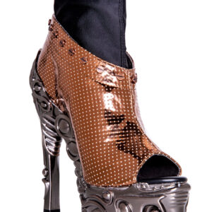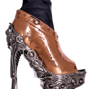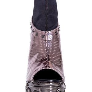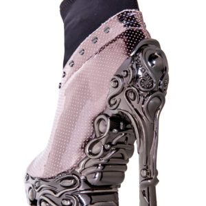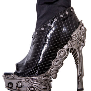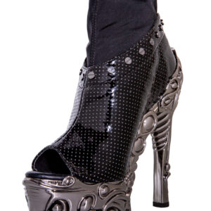 6″ custom molded heel w/ 1.5″ matching platform. Hades Proteus collection. Black patent vegan hologram upper w/ mini air holes. Silver metal studs lined on top with stretchable spandex inner for best fit and comfort