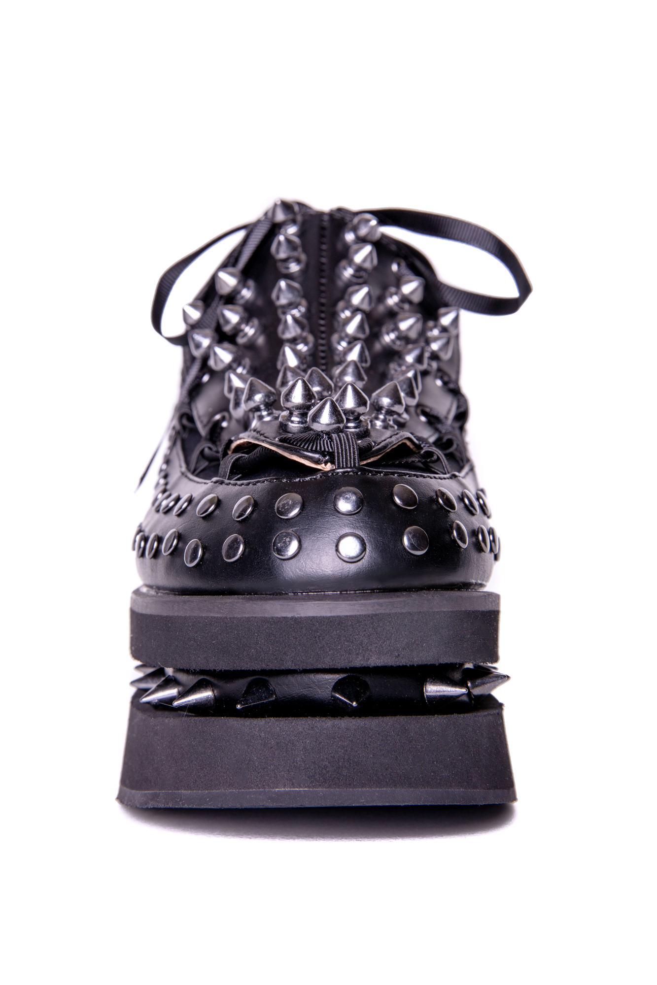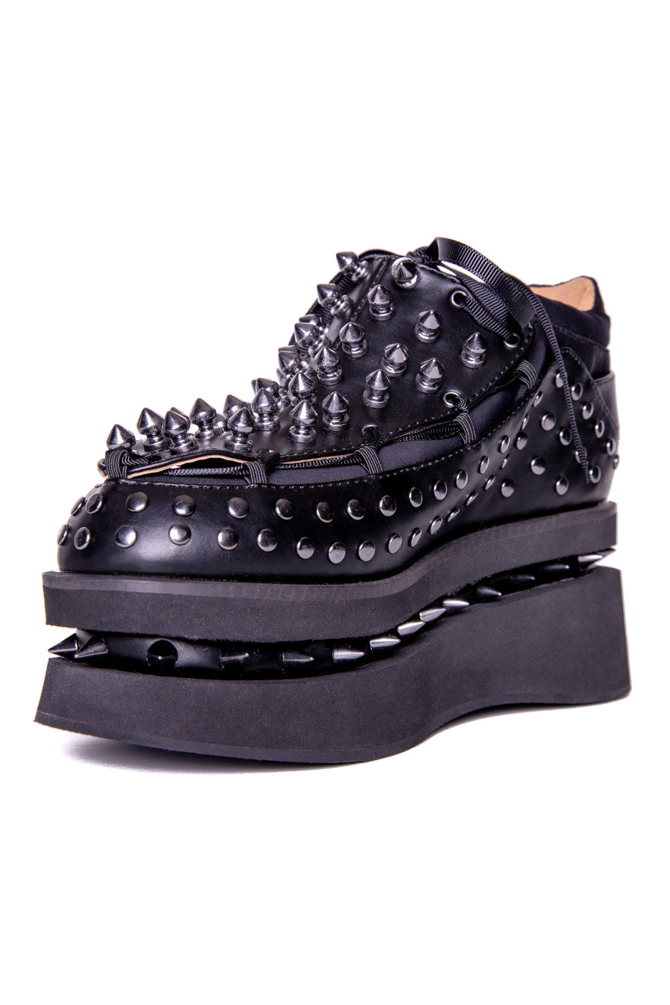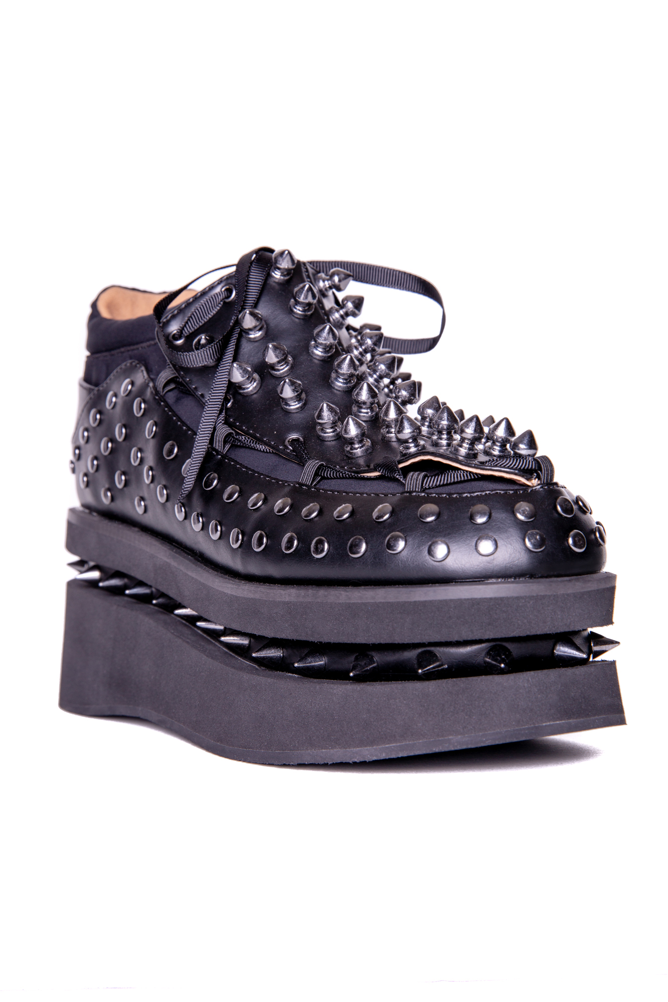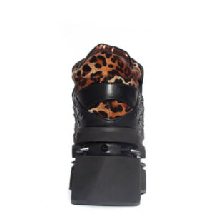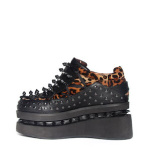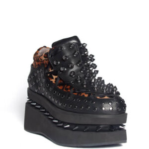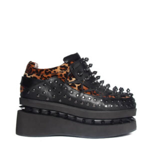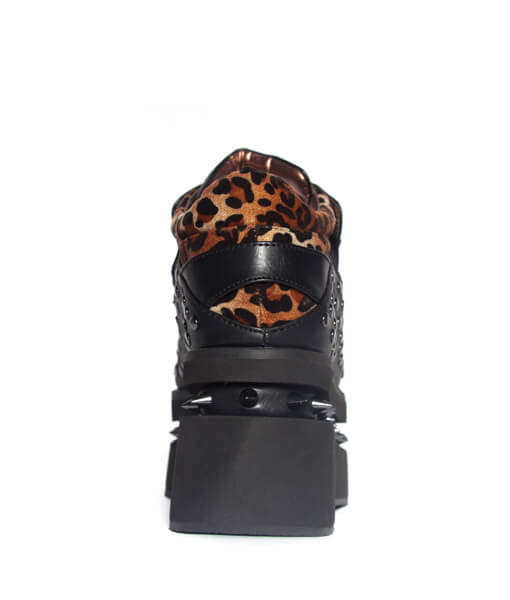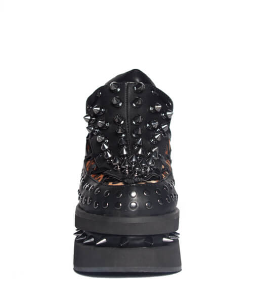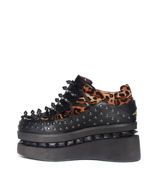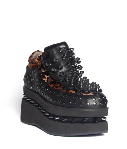 Black cheetah platform shoe with studded sides. Layered spike underlay with laced and spiked front.