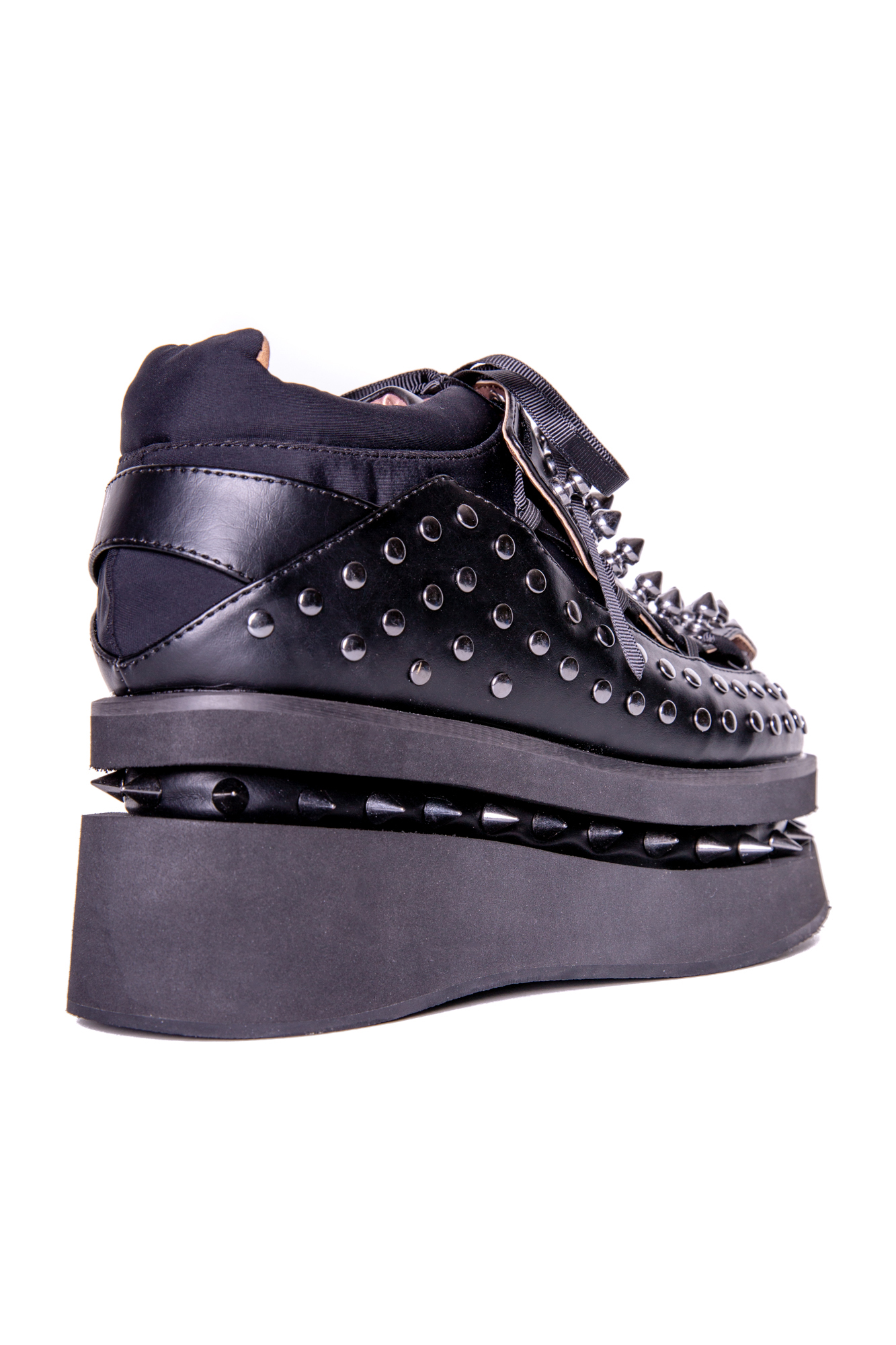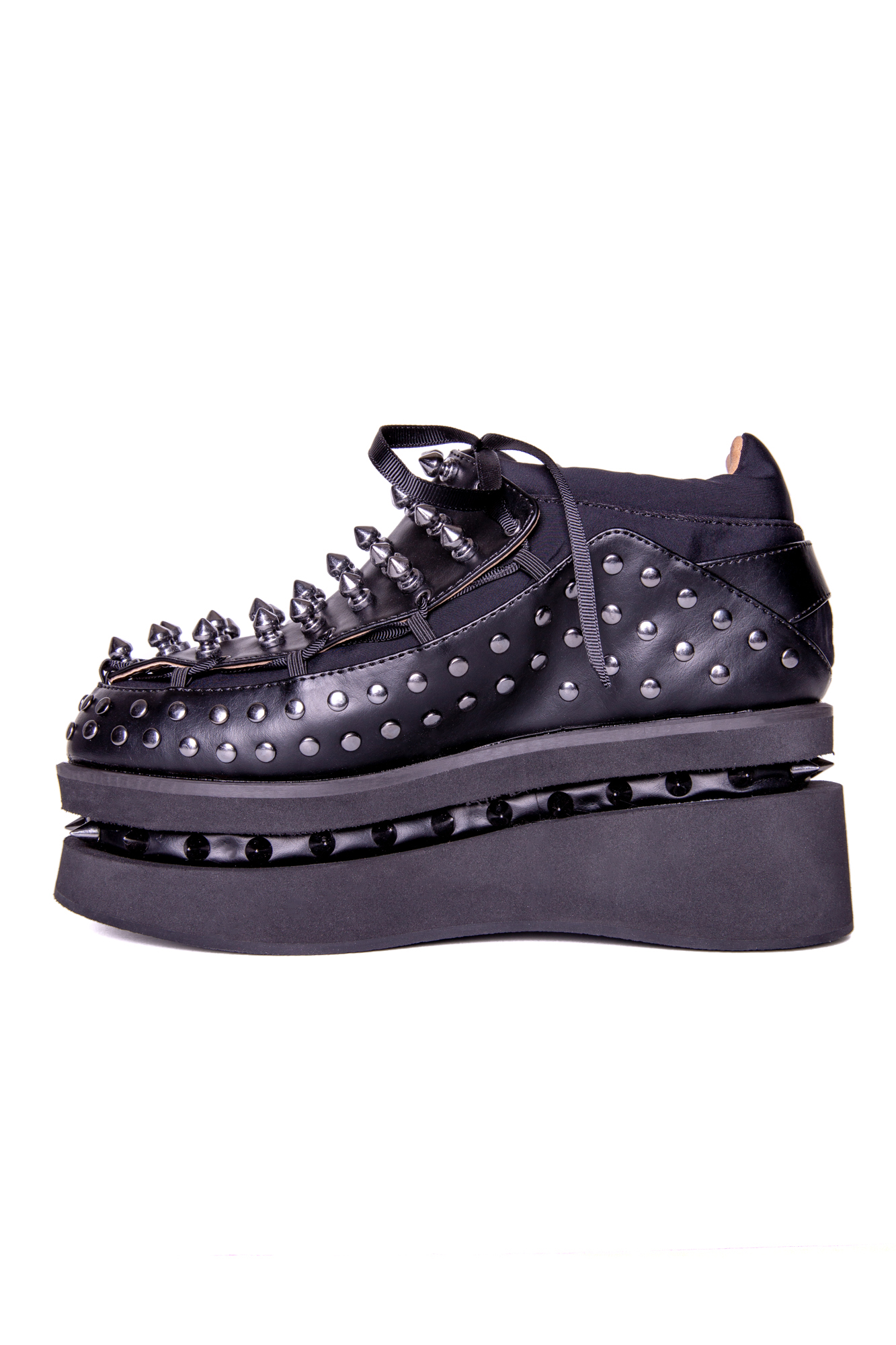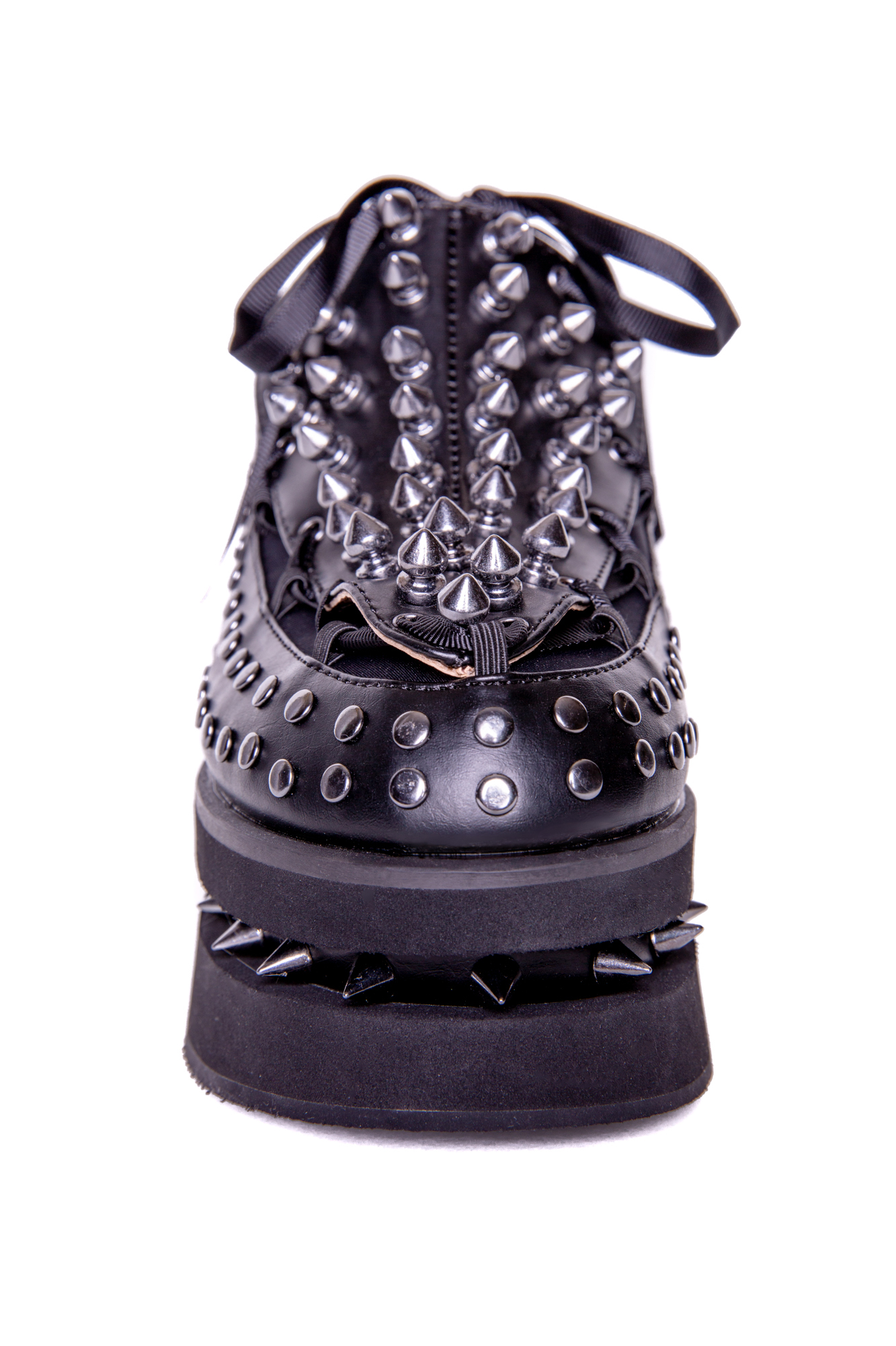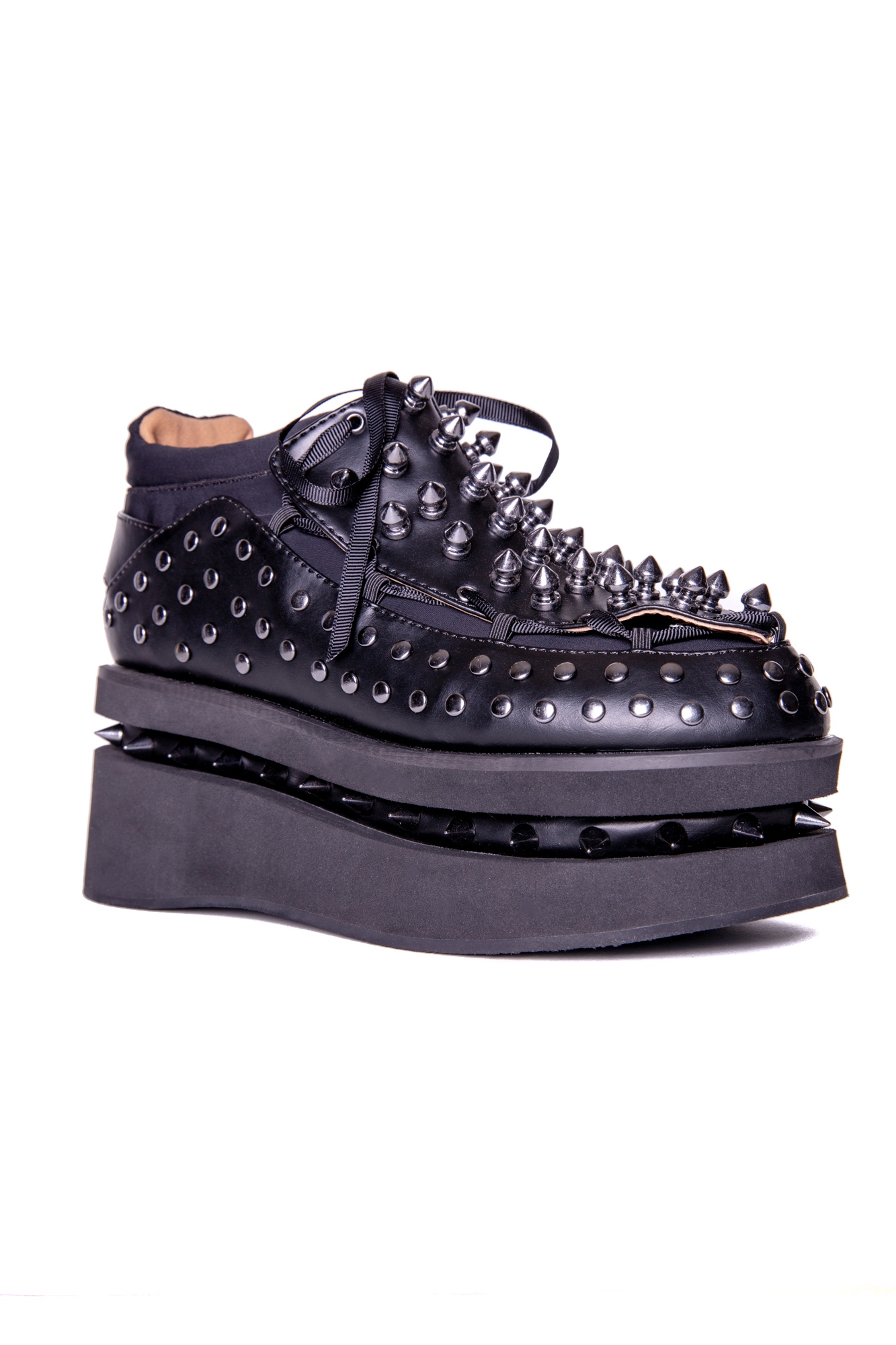 Black cheetah platform shoe with studded sides. Layered spike underlay with laced and spiked front.