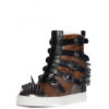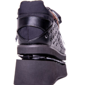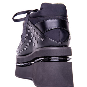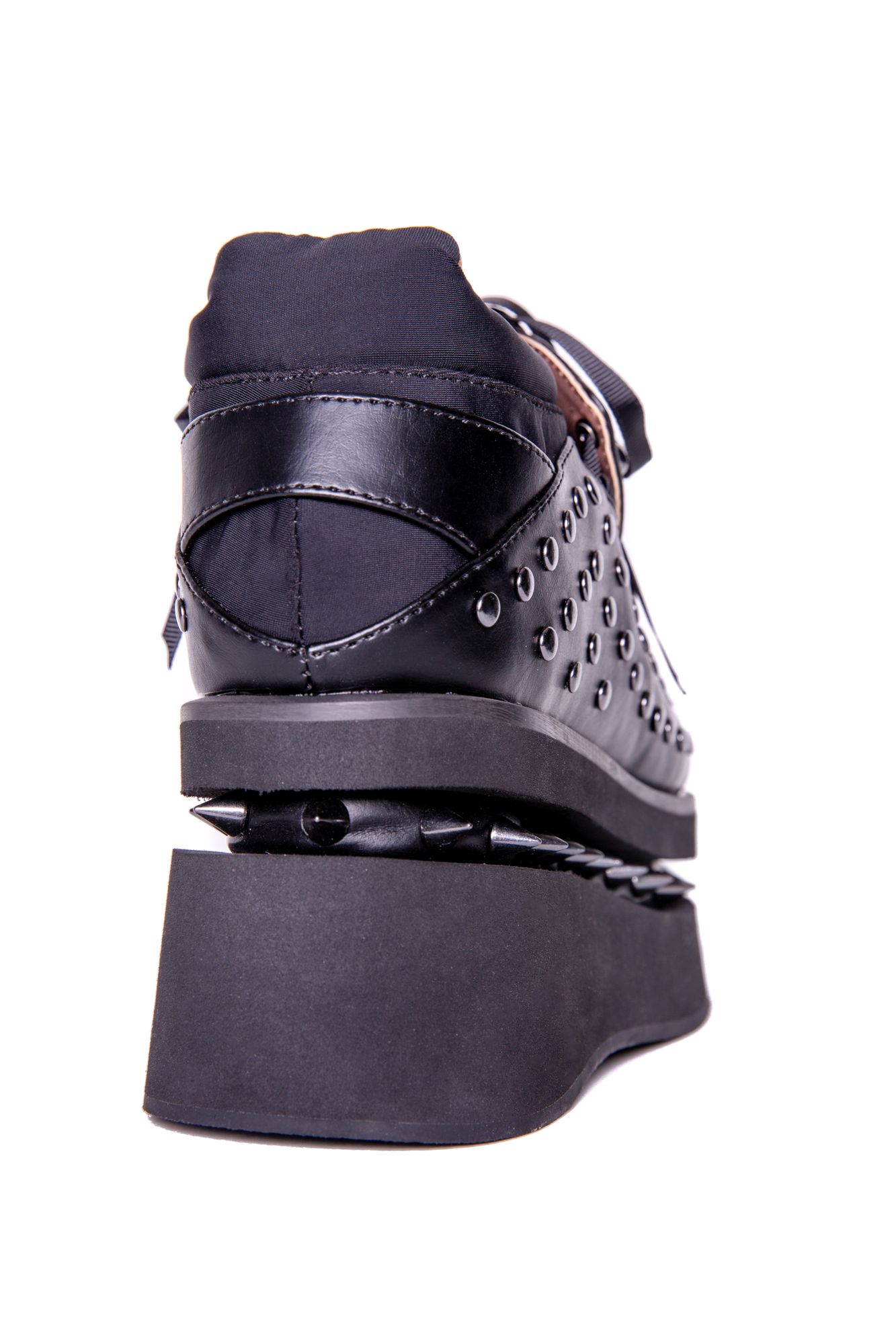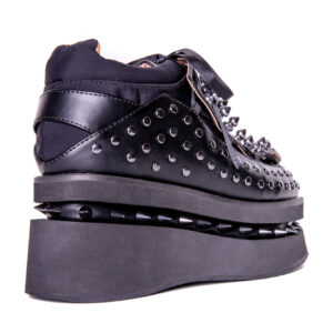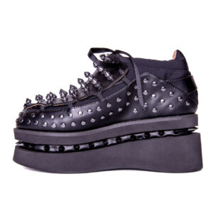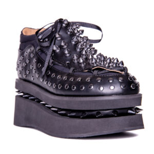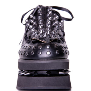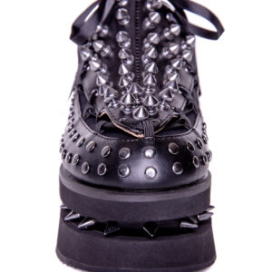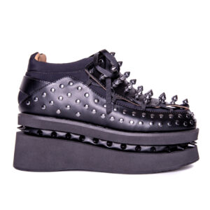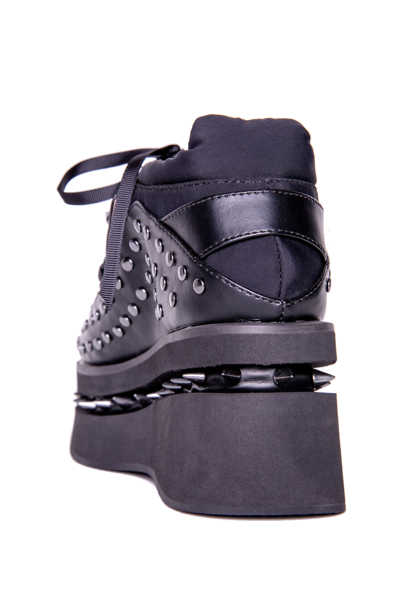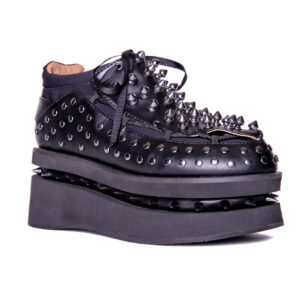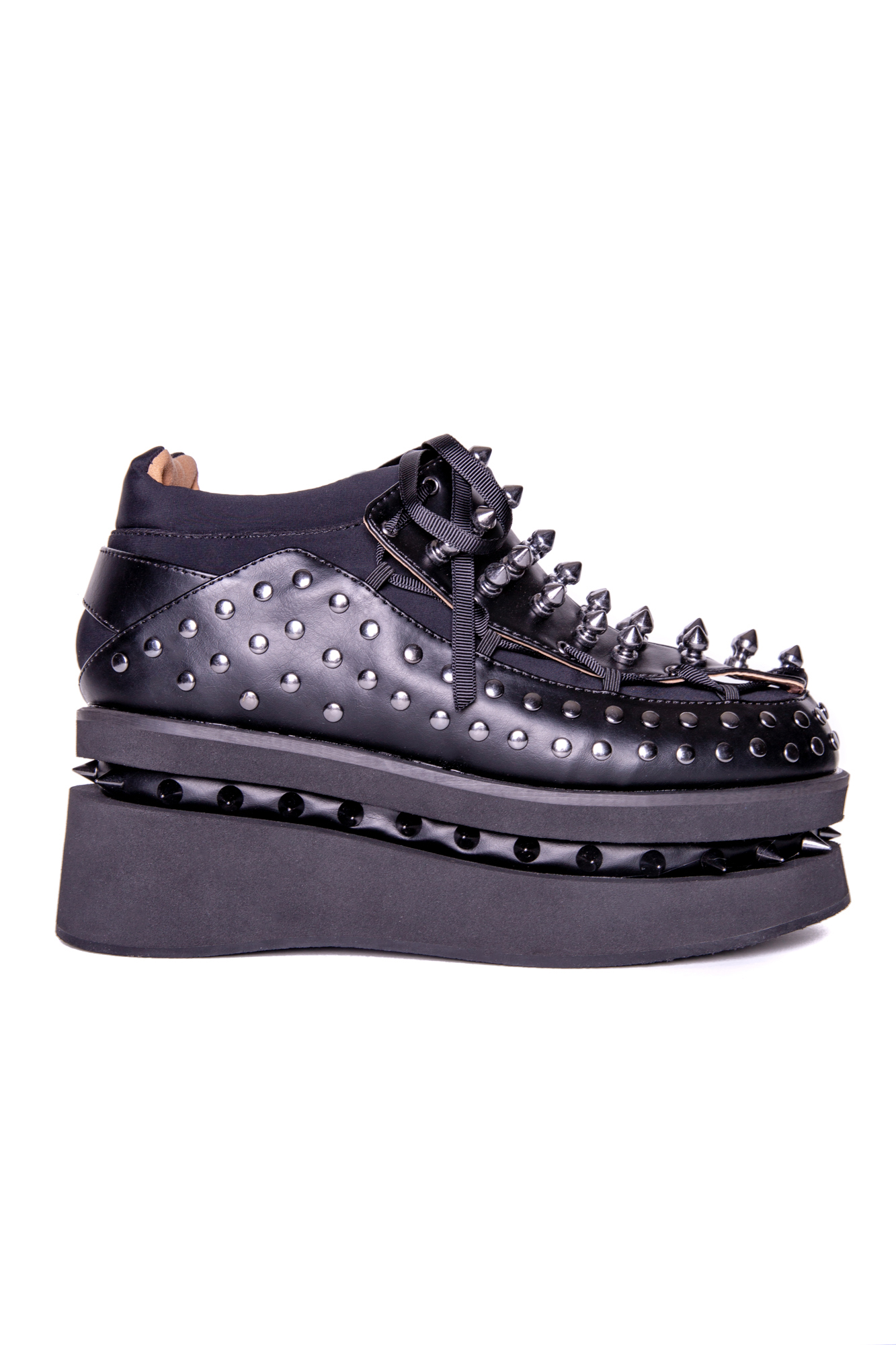 Black cheetah platform shoe with studded sides. Layered spike underlay with laced and spiked front.