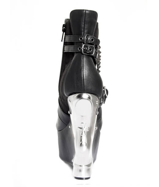 Black boot with silver accent plated wedge and strapped stud accents.