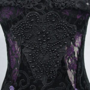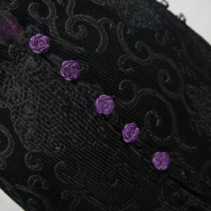 100% handmade Black polyester with velvet interior Thin shoulder strap Center front with three dimensional laced embroidery High quality spandex with nipped waist Resin rose button can be tied Adjustable back laces Breathable fabric Please refer to attached measurement chart for best size